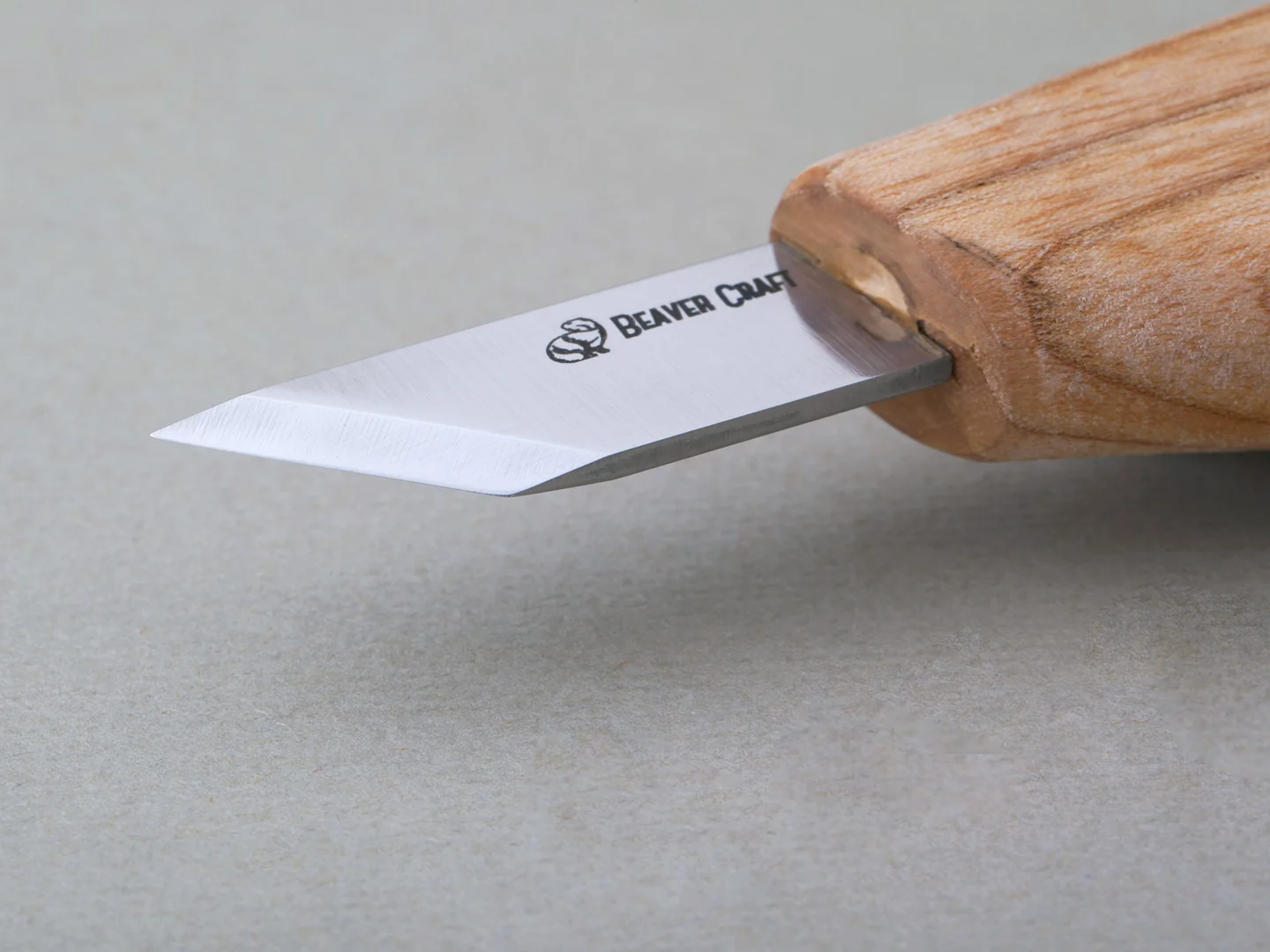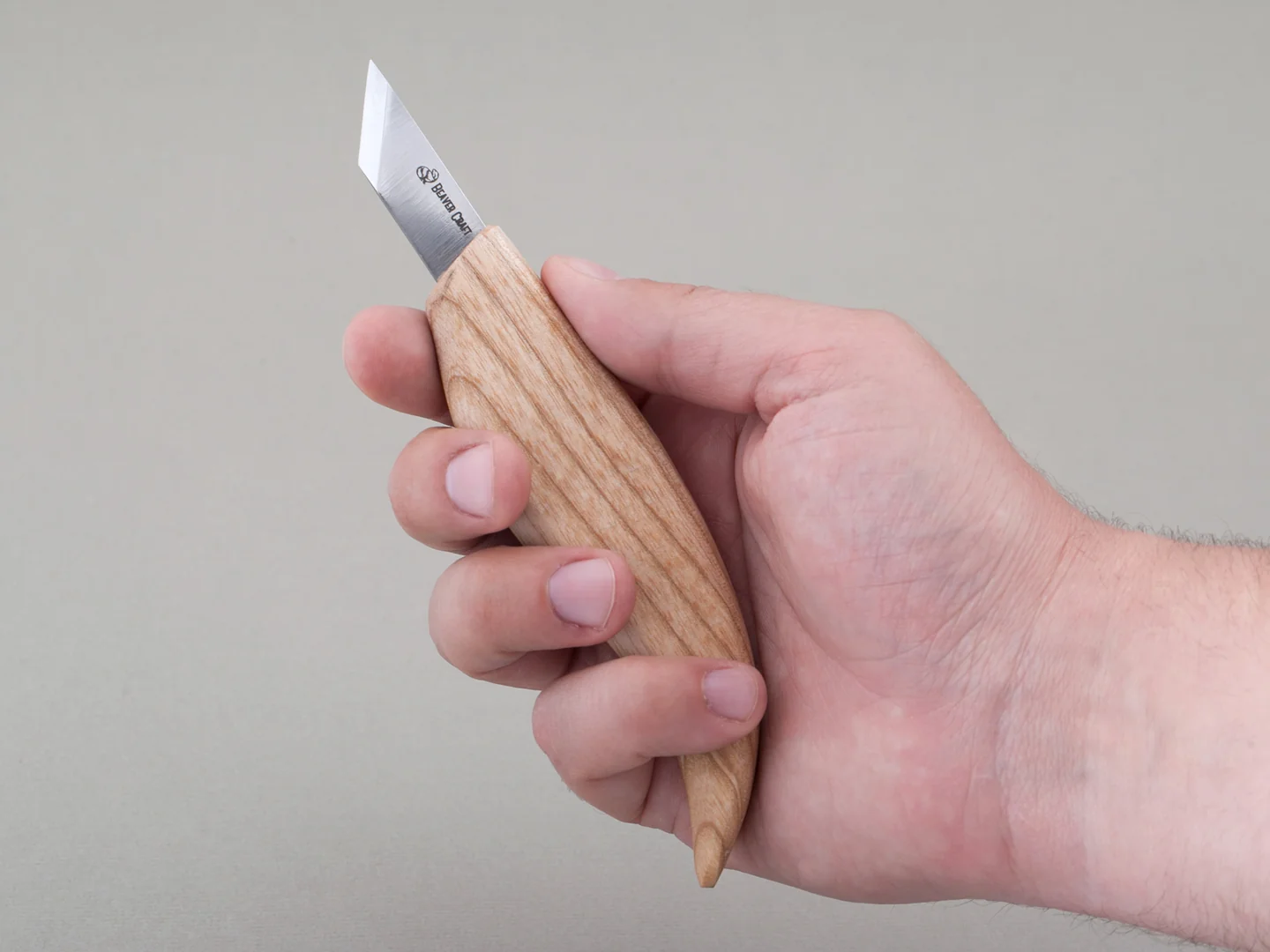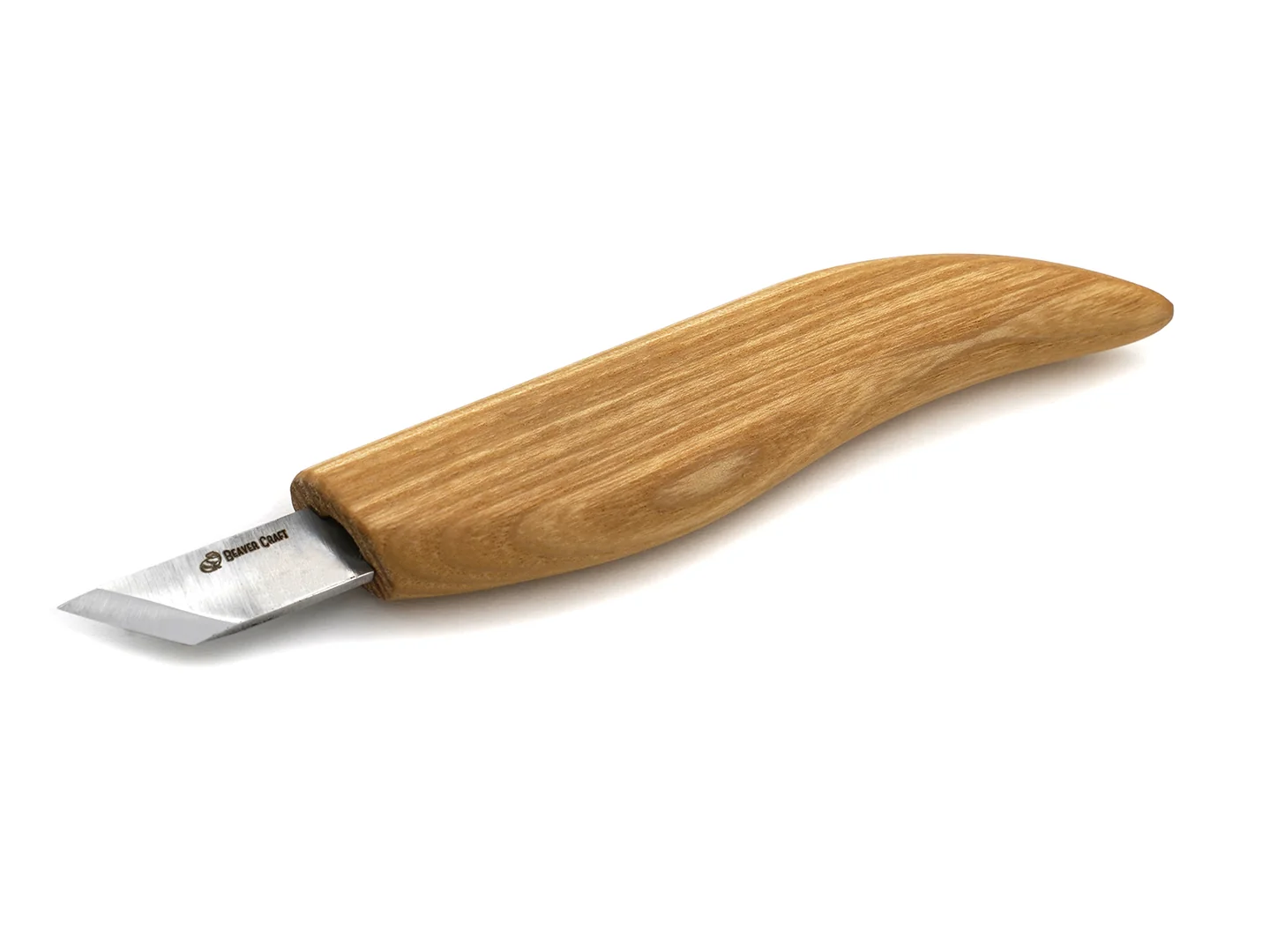 Лезо ножа косяка для різьби по дереву зроблено із довговічної високовуглецевої сталі, загартоване і добре заточене. Кут заточування і правильне гартування ножа для різьби по дереву дозволяють різати м’які і тверді породи деревини.