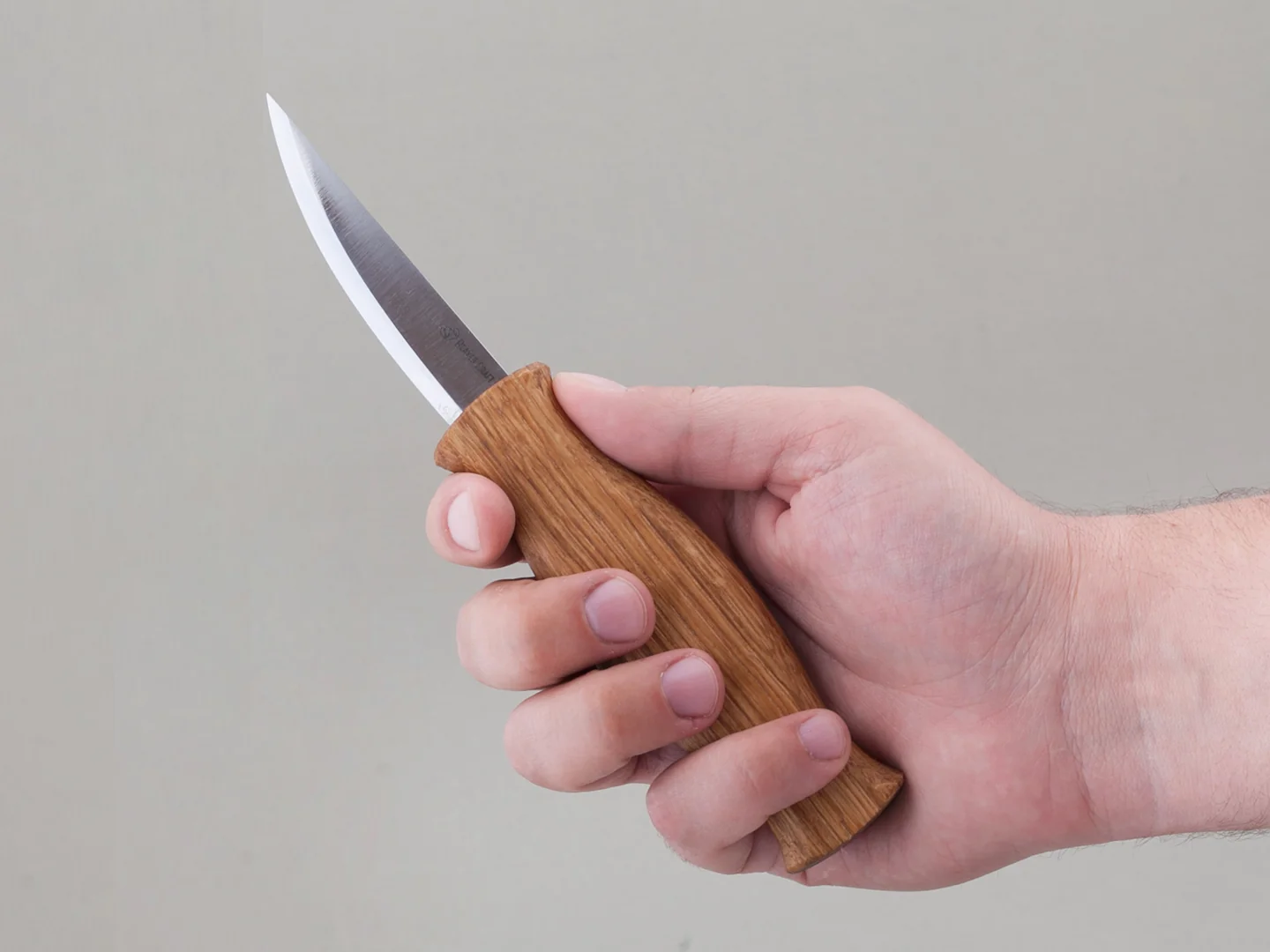 Полотно ножа для вирізання з дерева С4 зроблене з якісної загартованої вуглецевої сталі, добре заточене. Кут заточки дозволяє різати деревину м’яких і твердих порід.