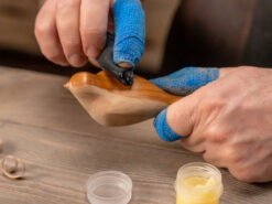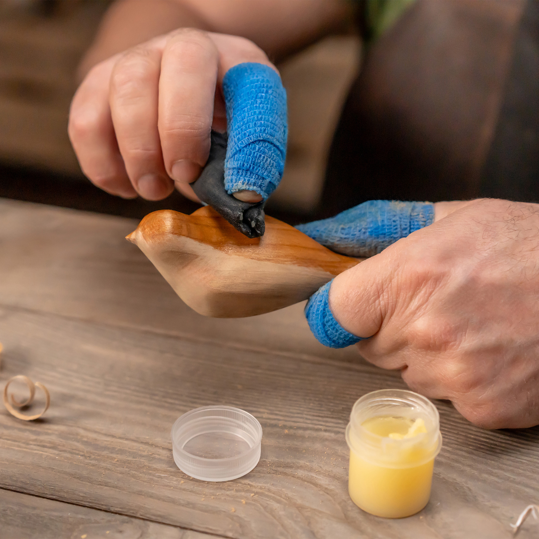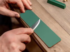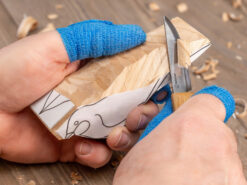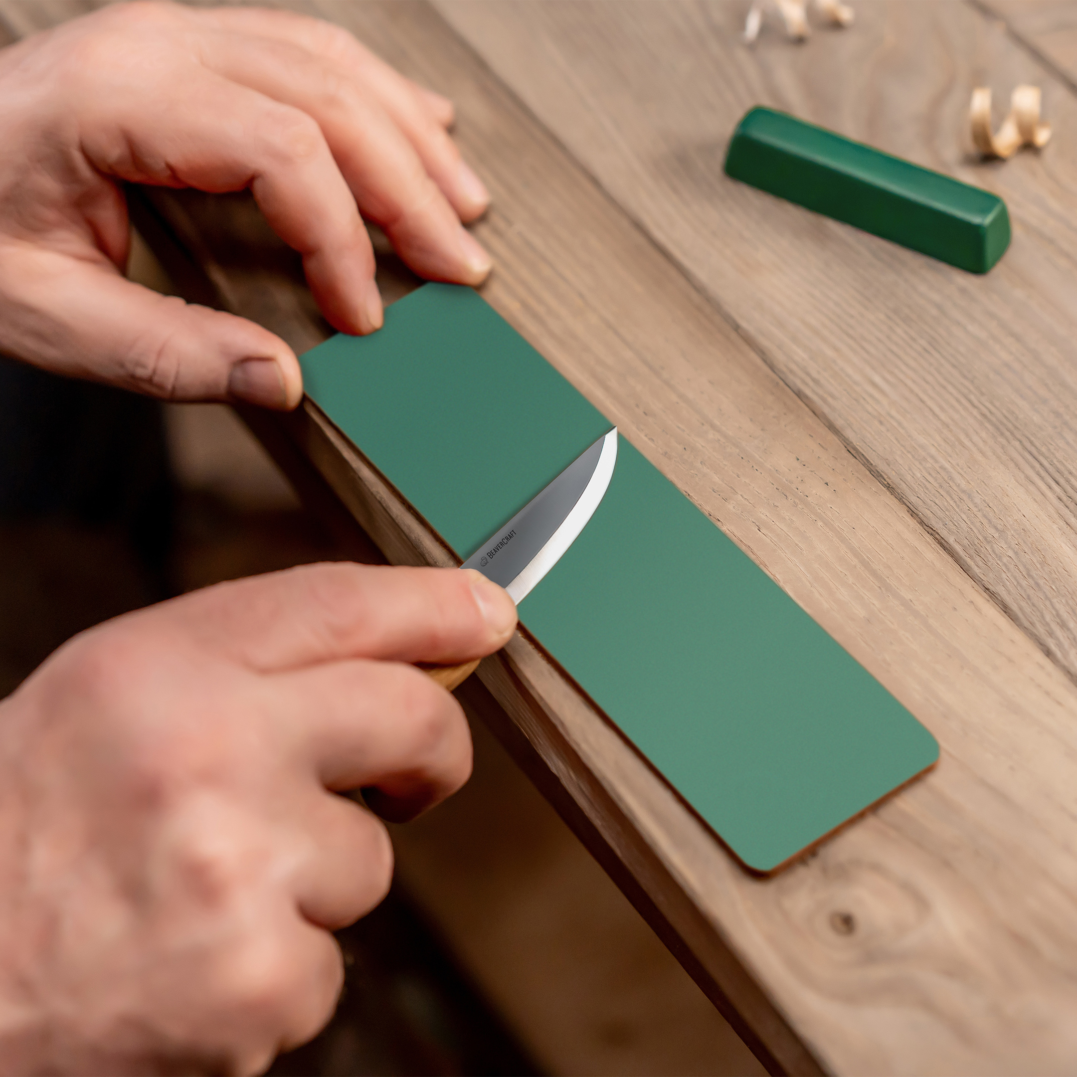 Шкіряний ремінь і полірувальна паста підтримують гостроту леза. Наждачний папір (5 шт., різна зернистість) вирівнює поверхню. Бджолиний віск підкреслює текстуру і захищає готову фігурку.