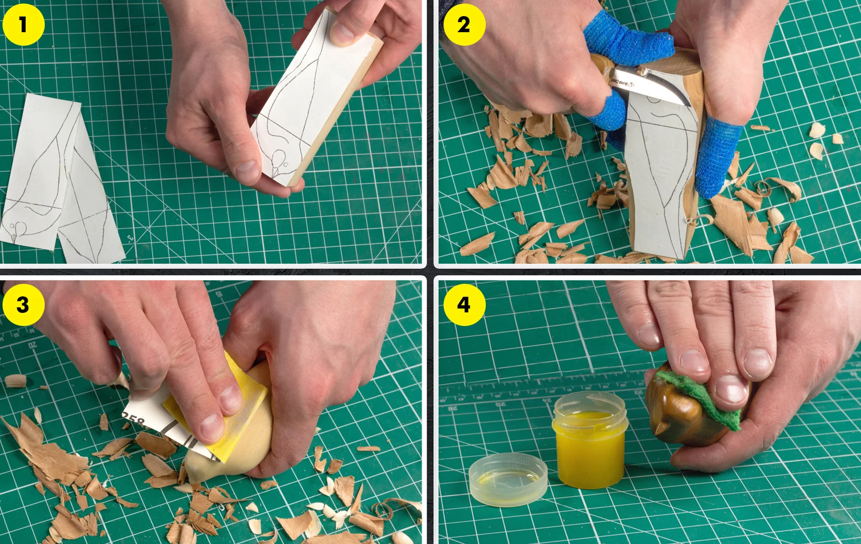BeaverCraft DIY01 містить усе необхідне щоб почати вирізання фігурки пташки. Тут ви знайдете два дерев’яні бруски (черешня та липа), ніж для зрізання з ідеально гострим лезом, паперовий шаблон для наклеювання на заготовку, необхідні інструменти для правки інструменту (шкіряна смужка і полірувальна паста), захисна стрічка та три види наждачного паперу. Все продумано так, щоб любитель різьби по дереву будь-якого віку міг отримати максимум задоволення від вирізання фігурки птаха з дерева.