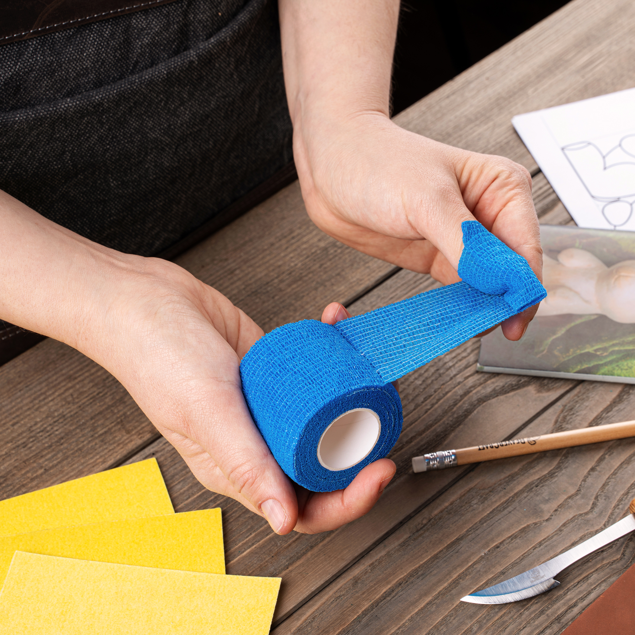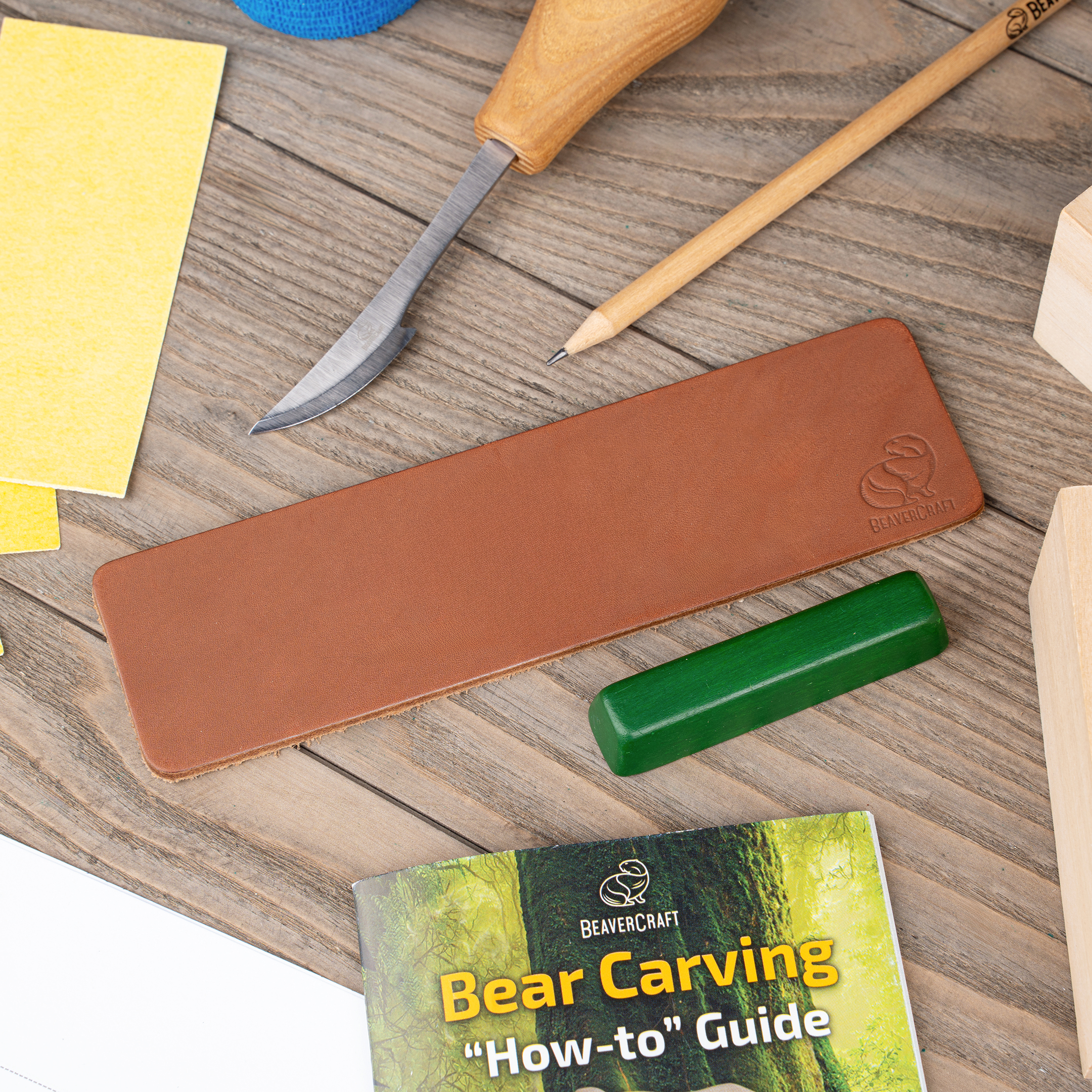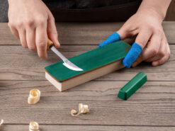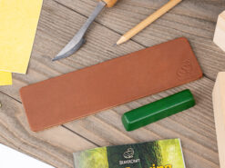 Шкіряний ремінь і полірувальна паста підтримують гостроту леза. Наждачний папір (3 шт.) для гладкої поверхні.