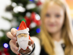 Олівець, пензлик і фарби дозволяють розфарбувати Санту у класичних кольорах або придумати власний образ.