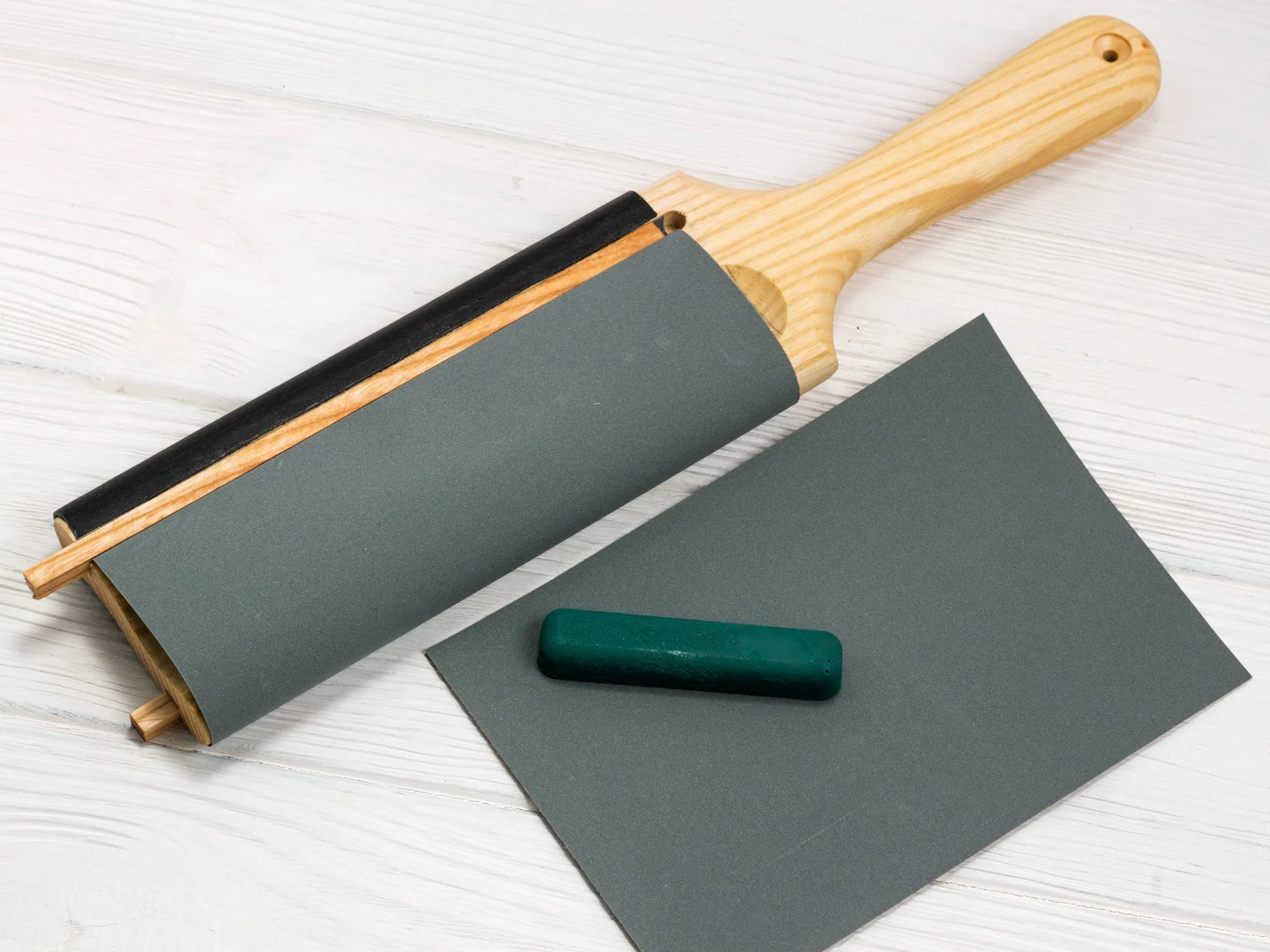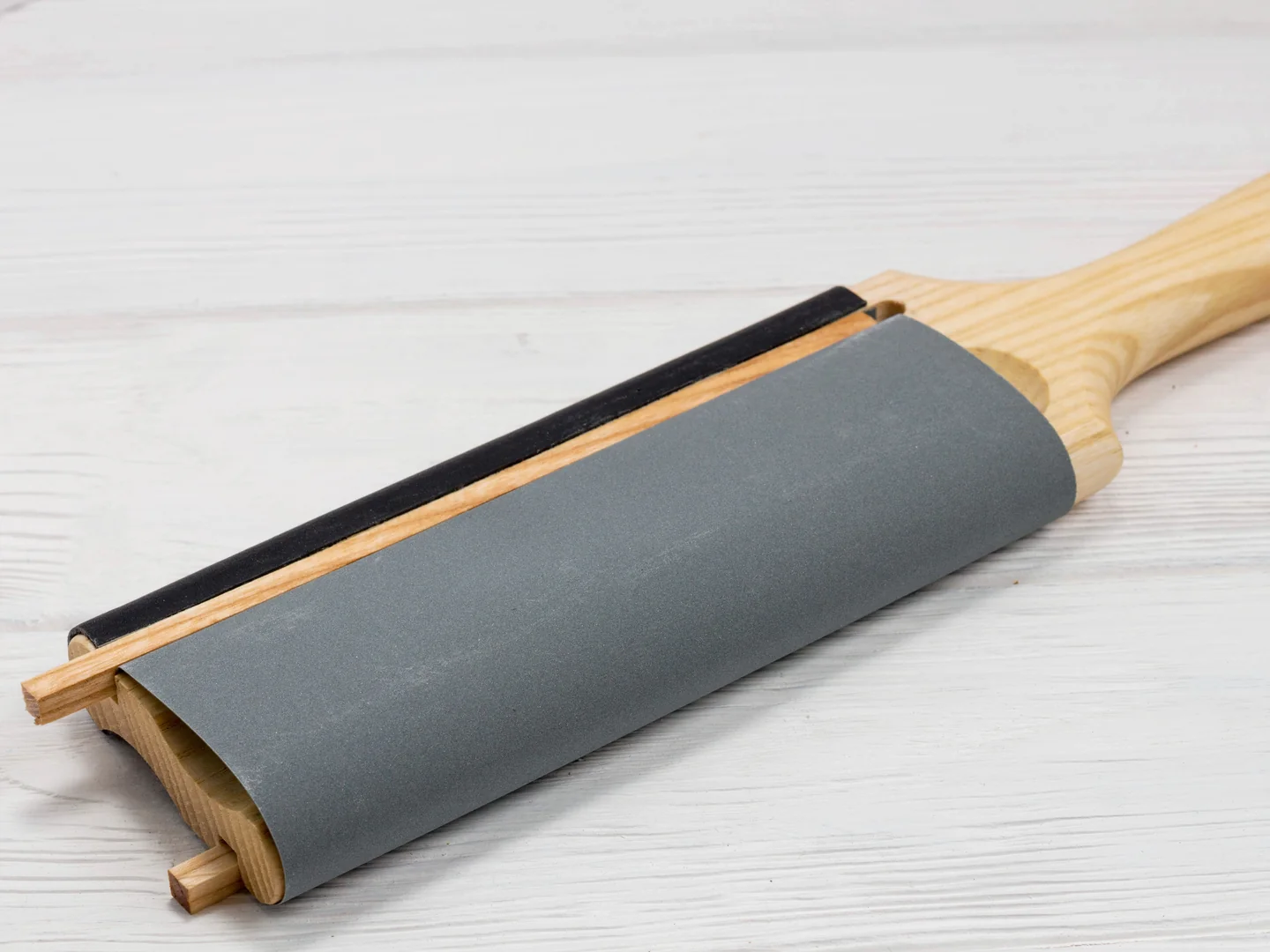 Дошка з заглибленнями для правки ложкорізів та стамесок комплектується двома смугами наждачного паперу.