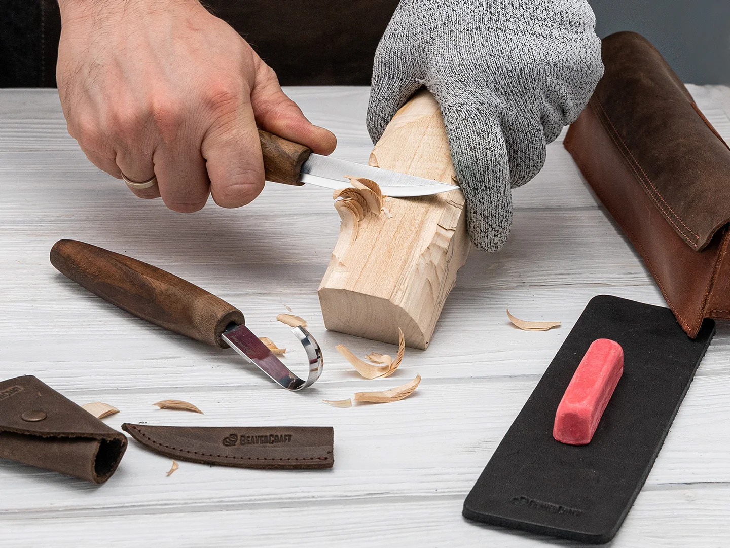 Преміальний набір для різьблення ложок — ножі із рукоятками з горіха і коричневий шкіряний чохол | BeaverCraft S01X Brown