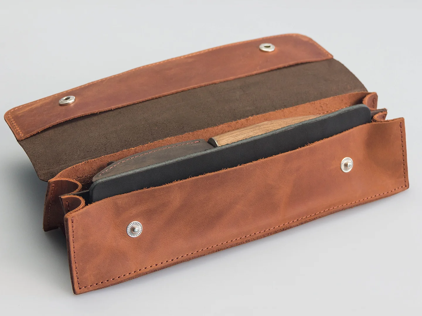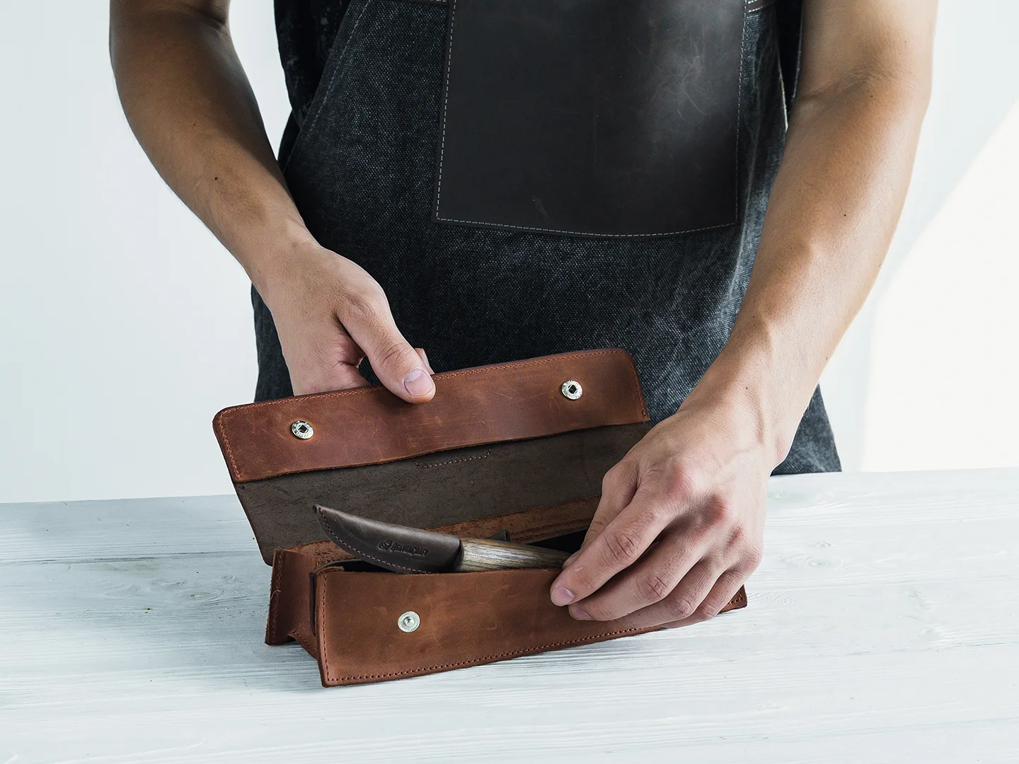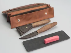 BeaverCraft S01X Brown — це преміальний набір для різьблення ложок із двох ножів із рукоятками з горіха в коричневому шкіряному чохлі, для різьбярів, яким однаково важливі якість інструменту і те, як він зберігається.