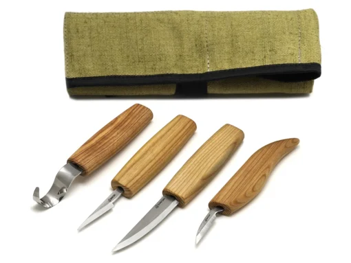 Цей чудовий набір з чотирьох ножів у міцному чохлі-скатці призначений для широкого спектру робіт з різьби по дереву – вирізання ложок, чаш, кукс, невеликих мисочок та піалок, інших дрібних виробів з дерева, декоративних елементів тощо.