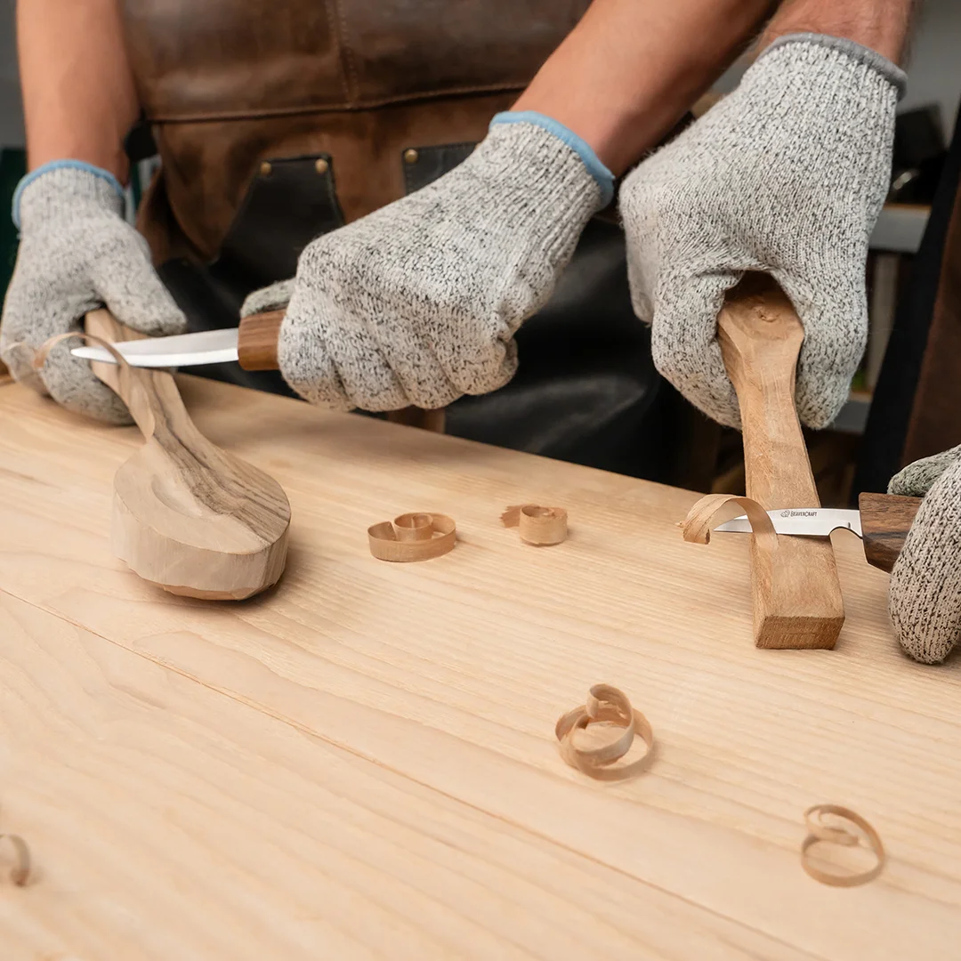 BeaverCraft S13X — це преміальний набір для різьблення ложок із трьох ножів із рукоятками з горіха в дерев’яній коробці, з заготовкою ложки в комплекті.