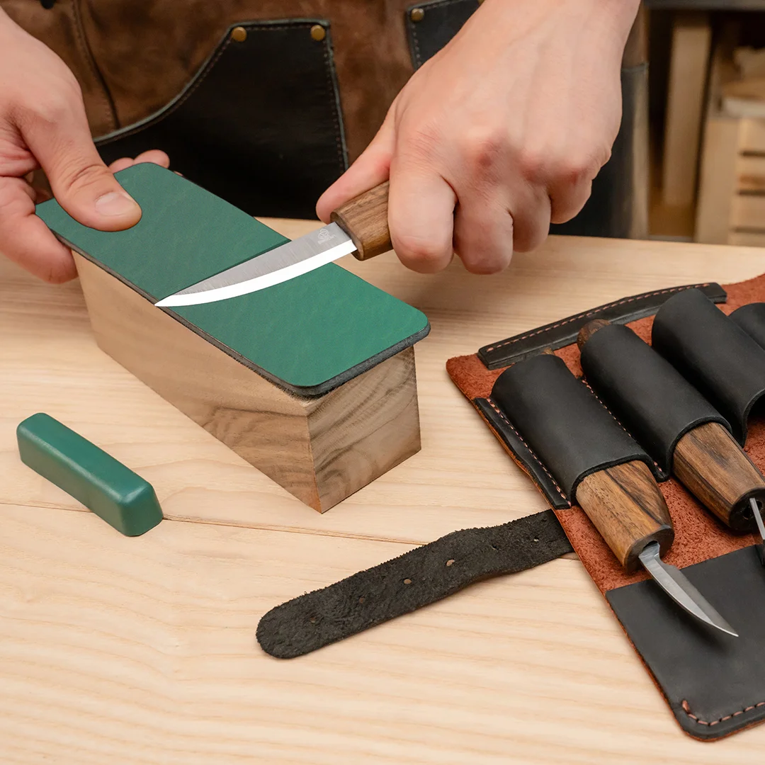 3 ножі (горіх) · Заготовка ложки · Шкіряний ремінь · Полірувальна паста · Дерев’яна коробка