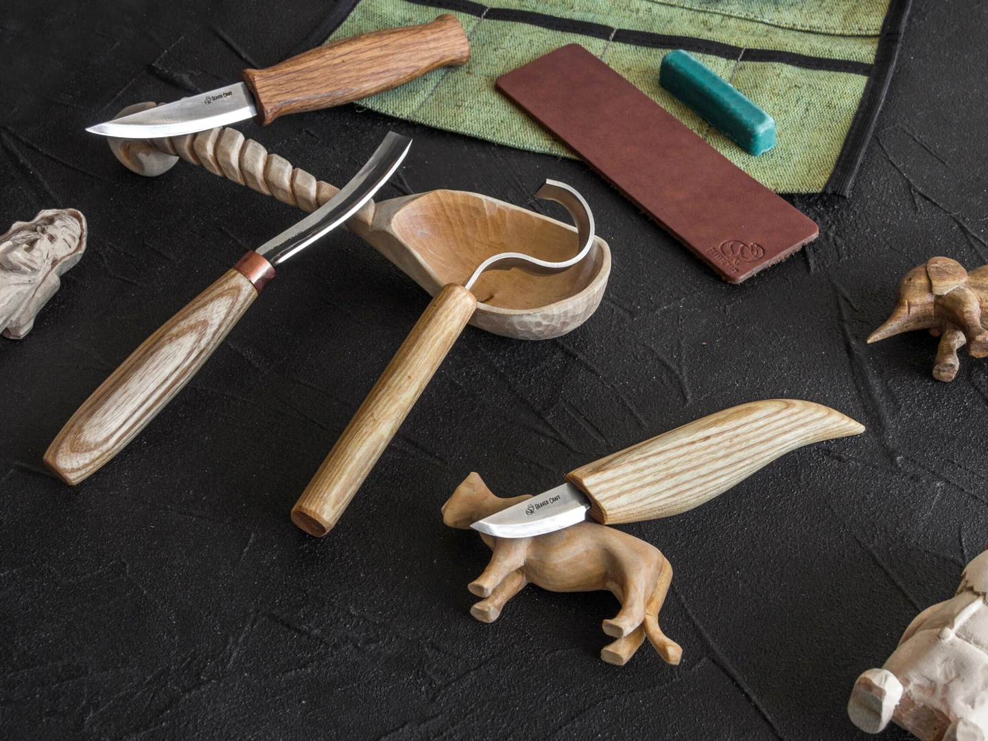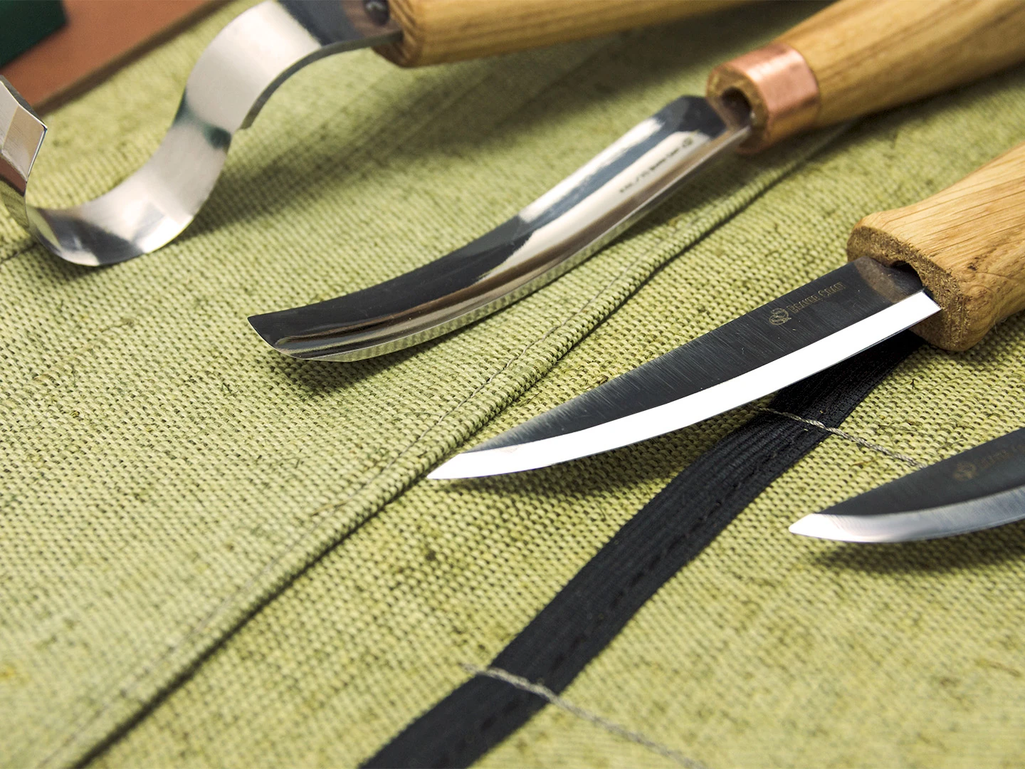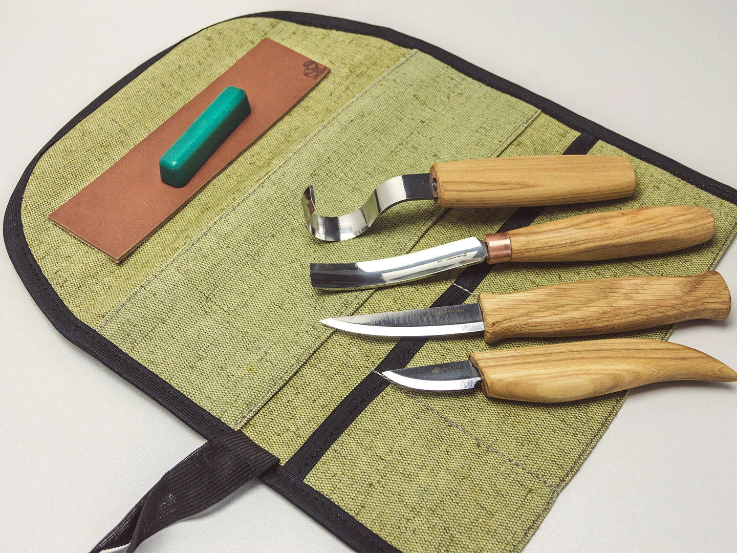 Цей набір для різьби по дереву включає в себе ложкоріз, ніж для вирізання, ніж для вирізання дрібної скульптури, напівкруглу (радіусну) вигнуту стамеску та смугу зі шкіри для правки інструменту і брусок полірувальної пасти. Набір поставляється в надійному та зручному чохлі, який підходить для зберігання інструменту та захищає його при транспортуванні.