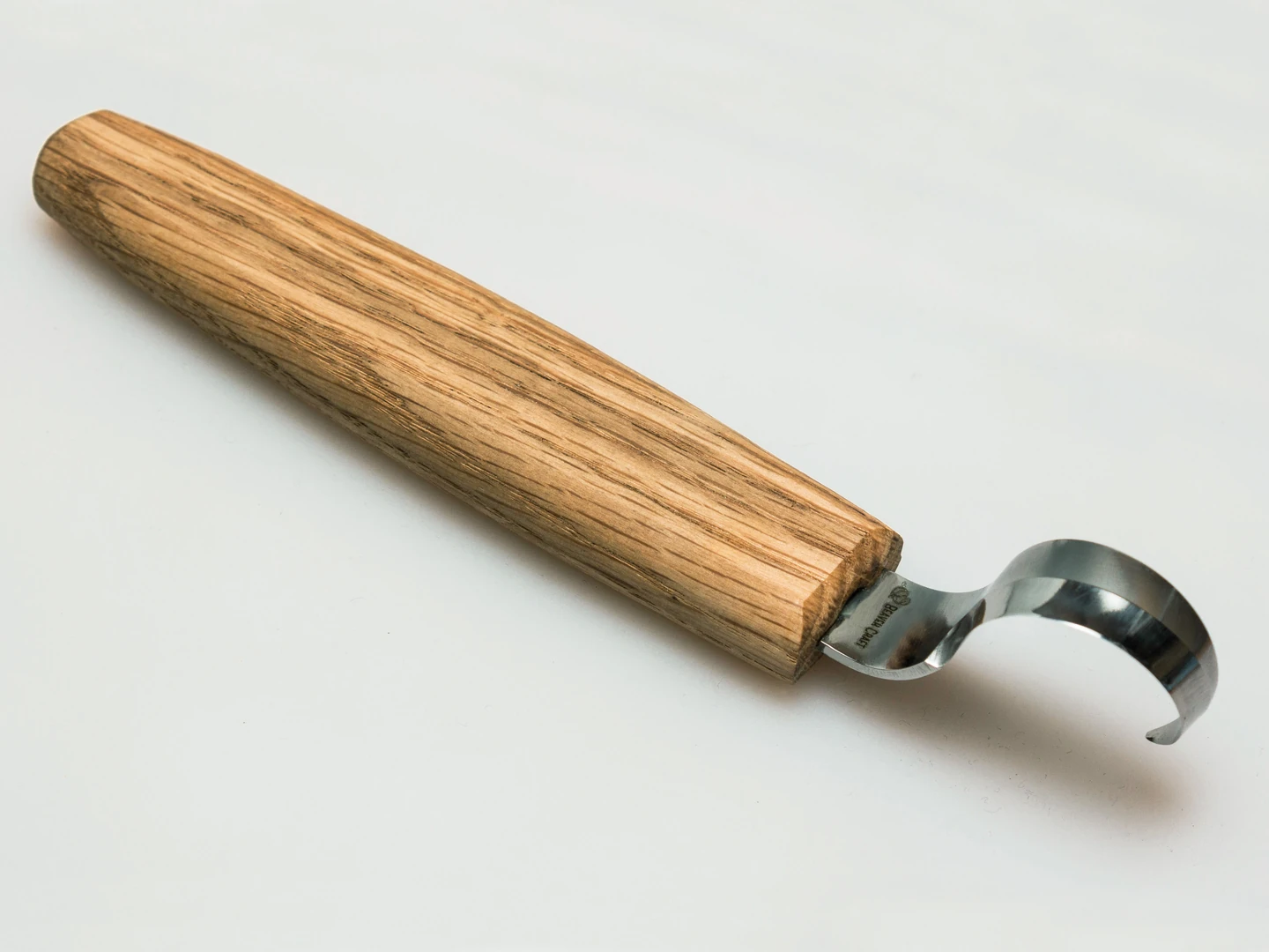 Лезо ложкоріза має одностороннє заточування, виготовлене із високоякісної вуглецевої загартованої сталі, добре заточене та доведене. Ручка інструмента зроблена із дуба, добре відшліфована, має зручну для руки округлу форму. Для правки ріжучої частини можна використовувати такі аксесуари, як дошка для правки або шкіряний пасок з нанесеною на нього полірувальною пастою.