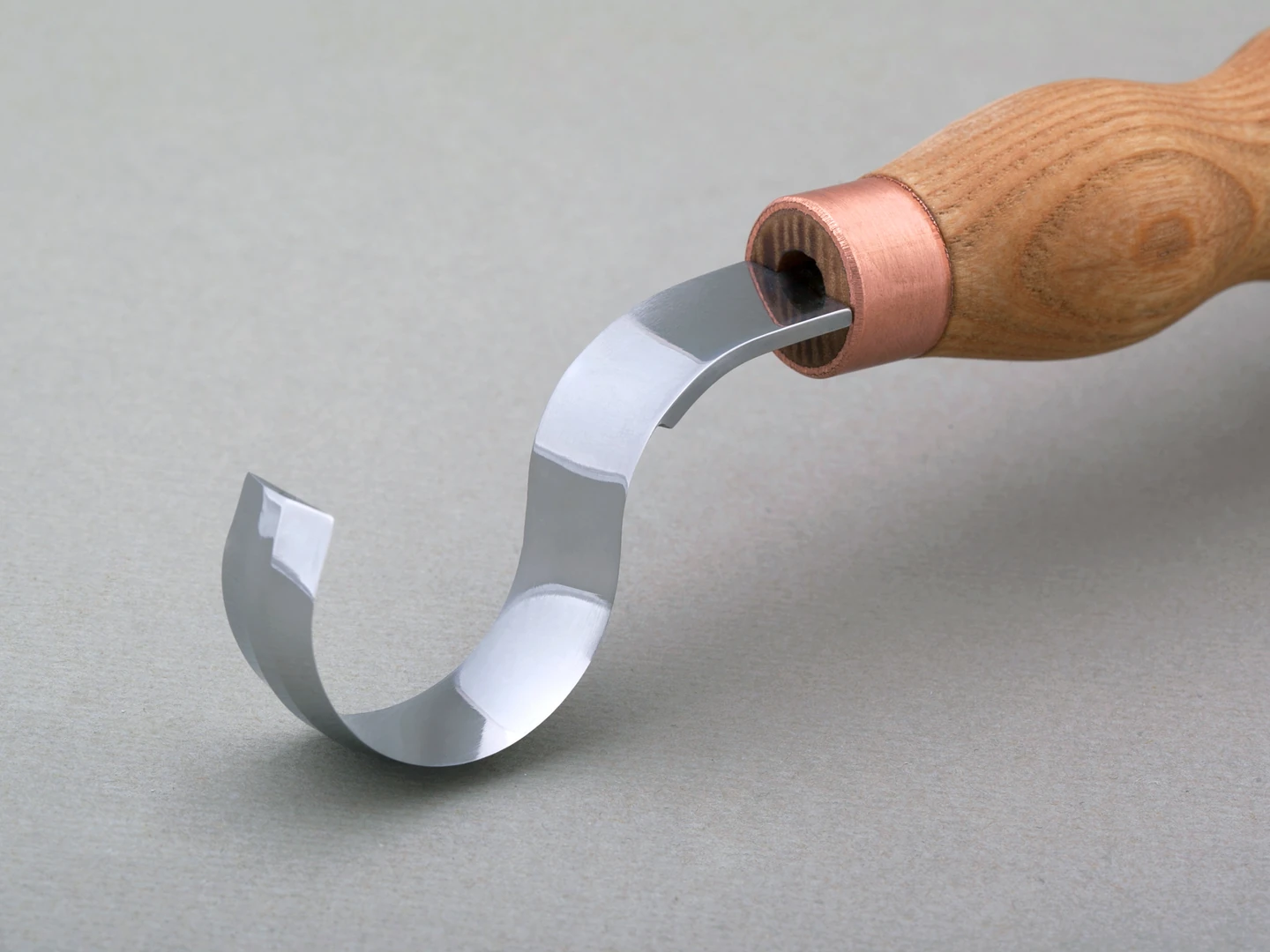 Ручка інструменту зроблена із ясена, добре відшліфована, не має гострих граней. Для правки ріжучої частини можна використовувати такий корисний акссесуар, як дошка для правки з нанесеною на неї полірувальною пастою. Лезо ложкоріза має двостороннє заточування, виготовлене із високоякісної вуглецевої загартованої сталі, добре заточене та доведене.