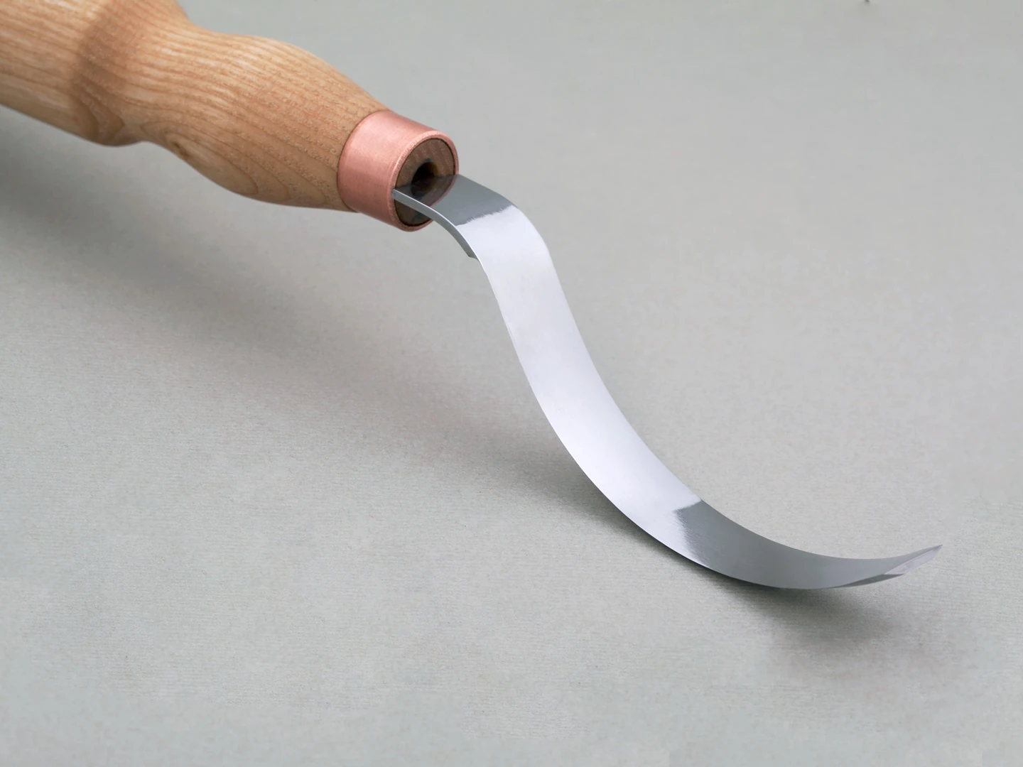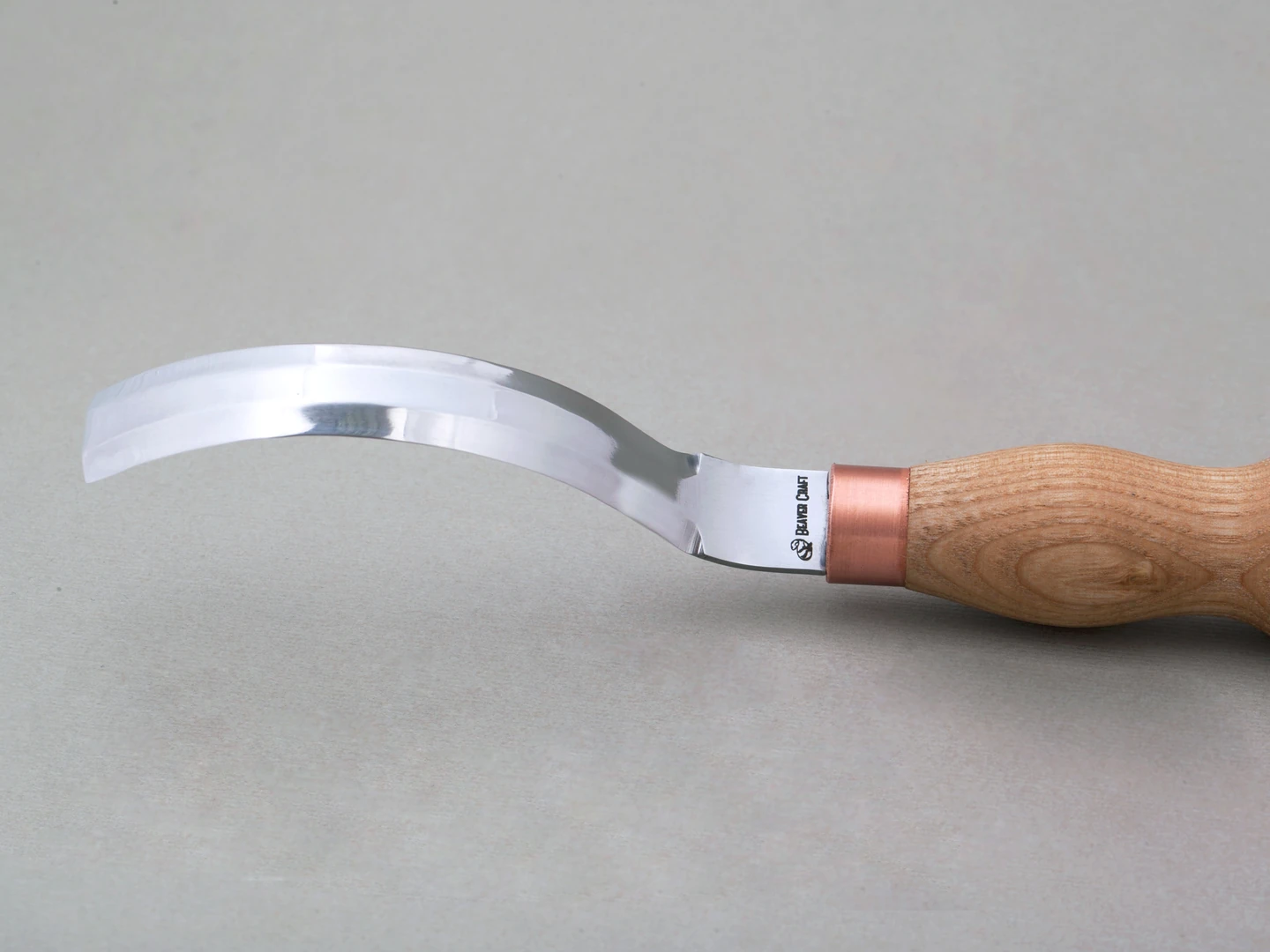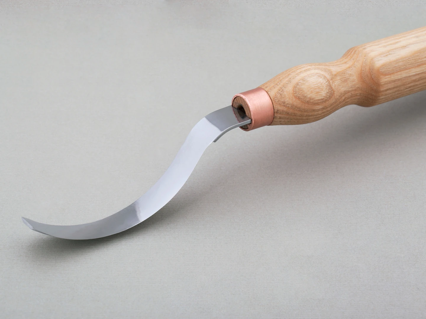 Ложкоріз SK3Long – інструмент для вирізання великих заглиблень в деревині з довгою ручкою та з двостороннім заточуванням. Це гакоподібний ніж для вибирання деревини при виготовленні великих виробів – тарілок, мисок, фінішної виборки та зачистки різноманітних радіусних елементів. Діаметр робочої ріжучої частини ложкорізу складає 90 мм.