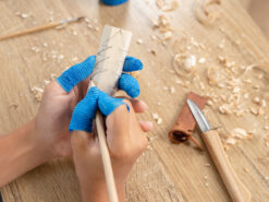 Набор для вырезания елки включает в себя специально специально разработанный нож для вырезания с закругленным кончиком, гардой и кожаным защитным кожухом – лучший выбор для детской резьбы по дереву ввиду функциональности и безопасности использования. В сочетании с тщательно подобранными брусочками из липы, наждачной бумагой, защитной лентой, карандашом, красками и кистью этот набор обеспечит вам приятный творческий процесс. Подарите своим детям этот набор для резьбы по дереву, который вдохновит их и сохранит заветные воспоминания. Вышеупомянутый специальный детский нож по дереву может похвастаться качественным лезвием из высокоуглеродистой стали, эргономичной ручкой из ясеня уменьшенного размера и защитными ножнами которые надежно защищают лезвие от повреждений, а его владельца от порезов. Несмотря на то что такая простая но надежная защита хорошо выполняю свою главную задачу, все же не рекомендуется носить инструмент в кармане, особенно подвижным детям. Работу по вырезанию елки рекомендуется выполнять под присмотром взрослых.